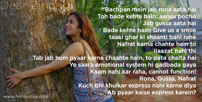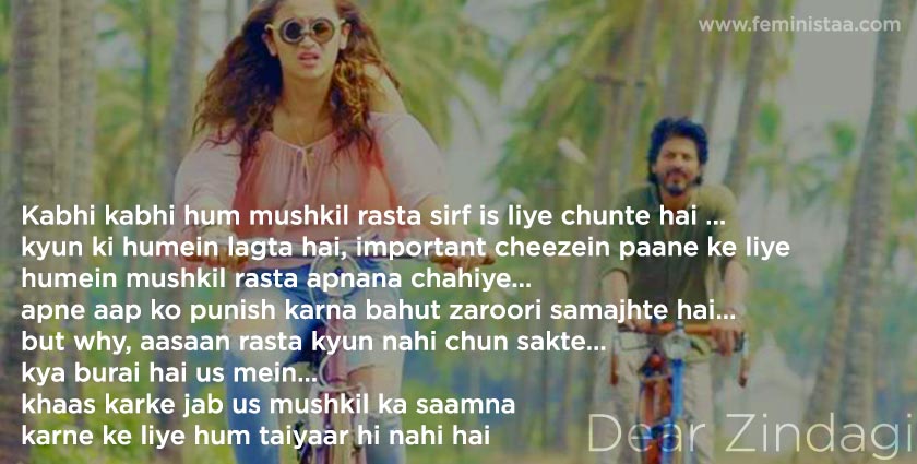 With “Tum agar khulke ro nahi sakogi … toh khulkar has kaise sakogi?” and with “Safe feel karne ke liye pehle saare dar mitana zaroori hai” among several other moments, Dear Zindagi gives us a slight, fleeting yet deliberate peek into the hidden treasures of vulnerabilities. To openly cry, to openly be angry and throw things, to own or to disown, and to openly be able to profess love despite knowing you can be turned down… maybe it is all worth taking a risk for? And what is a risk, even? If you feel it, you might just as well say it! And with it, only with it, will you come home to yourself and others.