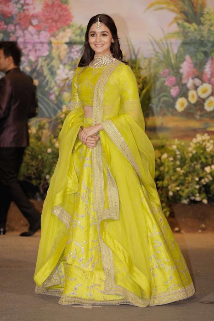 She looked pretty in a chartreuse lehenga by Sabyasachi that she paired with a choker necklace and a mang tika.