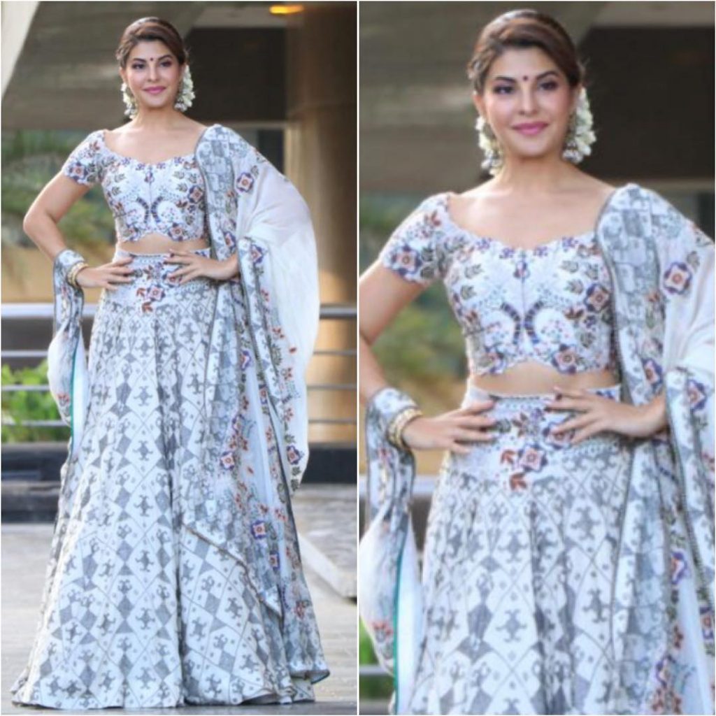 Jacqueline wore an ivory lehenga by Anamika Khanna. She looked drop dead gorgeous in a white and grey printed lehenga set with a matching dupatta. Her hair was tied in a low bun and decorated with a gajra, fresh face of makeup and a small bindi finished off her look.
